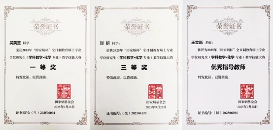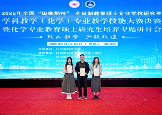 近日,2025年全国“田家炳杯”全日制教育硕士学科教学(化学)专业教学技能大赛决赛在哈尔滨师范大学圆满落幕。我校化学化工学院学科教学(化学)专业2024级研究生在本次大赛中凭借扎实的专业知识、优异的教学技能及沉稳的发挥,取得突破,首获大赛该学科领域一等奖。其中,来自首届“卓师班”的吴美萱同学和刘妍同学分获大赛一等奖和三等奖;王立新老师荣获“优秀指导教师奖”。