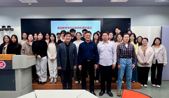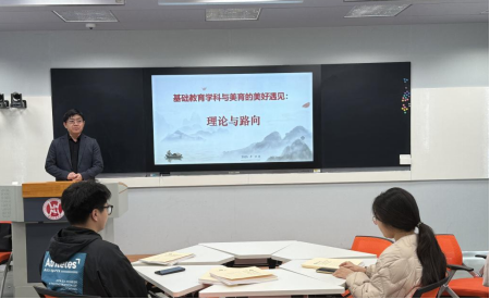 薛猛教授围绕“美育与基础教育的深度融合、学生审美素养培育、美育课程落地实施”等方面对中小学美育教学赋能的问题进行了详细讲解。首先,薛猛教授以立德树人为核心宗旨,系统解读了基础教育阶段美育与正确价值观塑造、审美能力提升、审美品格养成的深层关联。随后,薛猛教授分享了美育领域的最新学术研究动态,从教育家精神、中国学生发展核心素养两大维度,深入浅出地阐述了美育研究的深远意义。结合审美发展规律,薛教授重点分析了审美心胸、审美直觉感兴力和健康审美情趣养成的教学关键问题,聚焦美育核心能力与必备品格的培育。他指出,美育教学应兼顾审美标准与学生个性化偏好,在尊重学生独特审美偏爱的同时,坚守教学标准的严谨性与导向性,引导学生树立健康审美理想,培养兼具深厚人文素养、审美底蕴与创造表现力的未来教育工作者。最后,薛猛教授引用《论语》名句“质胜文则野,文胜质则史,文质彬彬,然后君子”作结,对同学们寄予殷切期望。