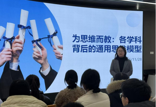 研讨会上,王泓娜老师结合理论知识与各个学科具体案例,阐释了模型思维、因果推理、类比思维、系统思维、批判性思维、量化思维六种通用思维模型的核心要义。同时,王老师邀请同学们分别从不同学科视角出发,分享对各个模型的理解,指出掌握这些思维模型在培养学生高阶思维、提升问题解决能力中的关键意义,并结合案例分享了元认知提问句库、思维可视化、“思维切片”微型刻意练习三大教学实践利器及其适用条件。最后,王老师在总结中谈到,将隐性思维显性化,让思维方法成为可见、可学、可教的内容,是思维教学落地的关键。希望同学们积极探索思维模型与学科教学的融合路径,为培养适应社会发展的“会思考的学生”做好充分准备。